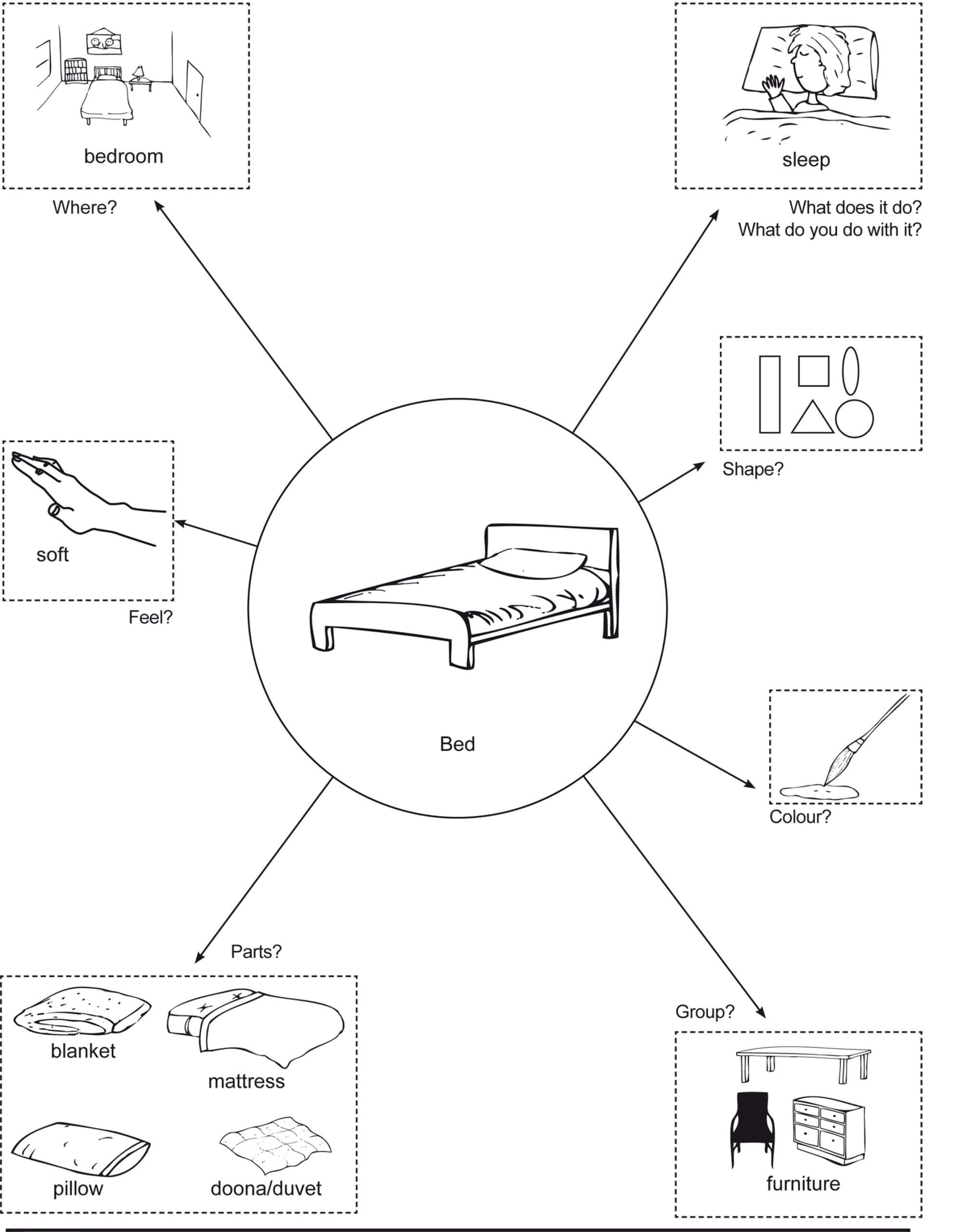 Using the specific prompts radiating out from the centre object, you can help your child define a word. You may ask your child to place a counter on each prompt as he describes the object or he may prefer to trace along the line which leads to the prompt.